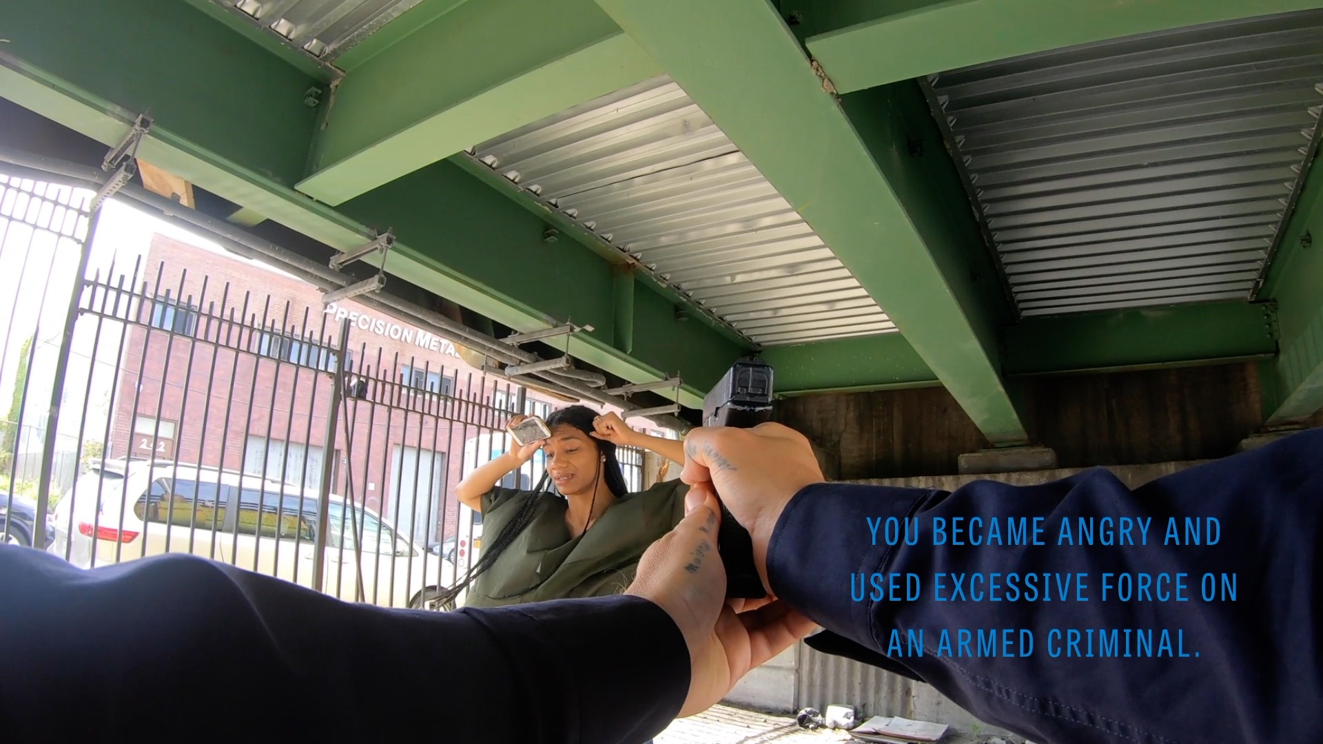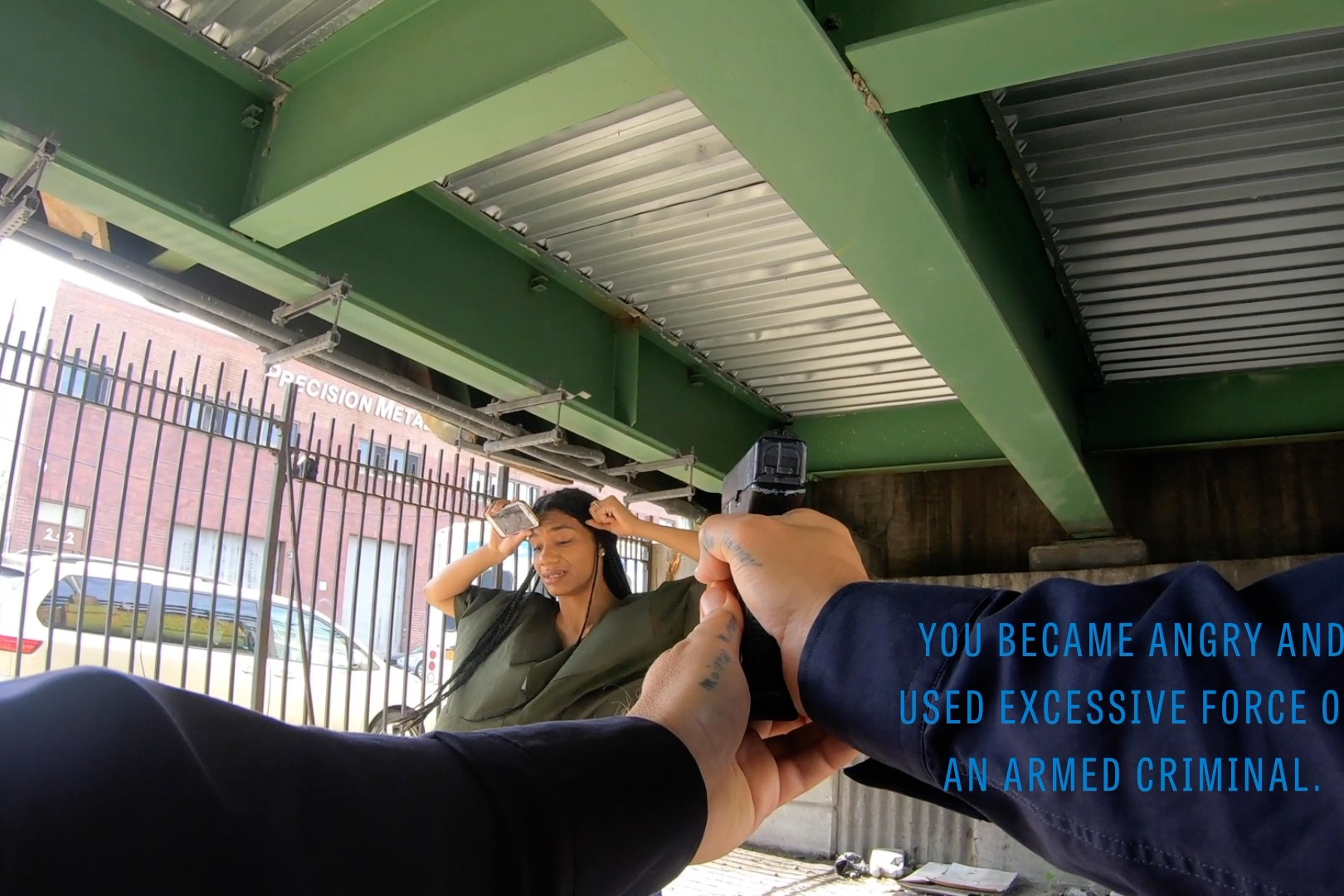 Faced with a split-second decision, the participant must respond to an unfolding police encounter. The individual they confront may be experiencing a mental health crisis, may be Black or white, criminal or civilian — but the outcome doesn’t depend solely on what’s happening.